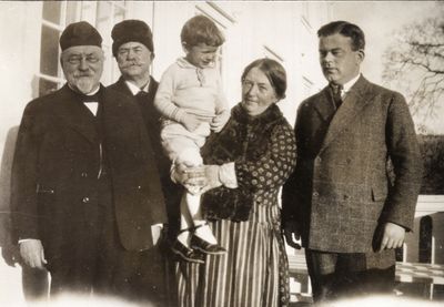 Fire generasjonar på verandaen i prestegarden. Frå venstre: Hans Huglen (far åt Kari), Anders Hovden, Kari Hovden f. Huglen med vesle-Anders Sopp Hovden på armen, Hroar Hovden.