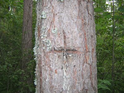 «Dødskorset» i Kongsberg. Vi beveger oss nå på den gamle stien som går til høyre oppover svaberga. Dette er den opprinnelige stien. En nedre sti til venstre blei seinere anlagt for bedre skiløype. At det var skiløype på den gamle stien, bekrefter korset i furutreet da en ung gutt kjørte rett inn i et tre her og døde av skadene. Dette skjedde på våren 1937. Stien fortsetter videre opp den såkalte Thorbergåsen. Muligens etter en familie som eide løkker lenger ned.