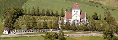 Ås kirkegård ved Ås kirke. Kirkegården er utvidet vestover (til venstre) etter at bildet ble tatt.