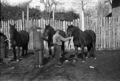 Folk og hester på Øst-Kvem. Mannen i mørk dress er Anders Madsen Hveem, og kvinnen er kona Fredrikke. Den tredje personen er ikke identifisert.