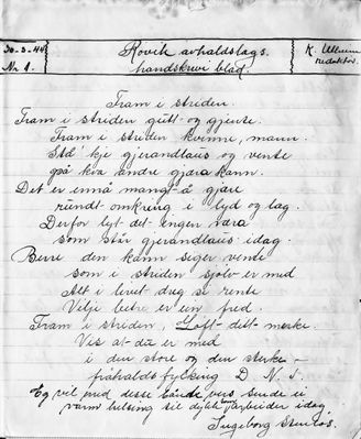 «Kjære avhaldsfolk! Lat oss stå fast og saman stride./Vi hev ei stor opgave./ Lat oss bed i saman om å få brennevinet - bort - / for det er stor sorg når slikt kjem inn, /blant ungdomen og folket, og landet vårt./ Lat vi om vi er få halde fram,/ om det blir motbør.»
