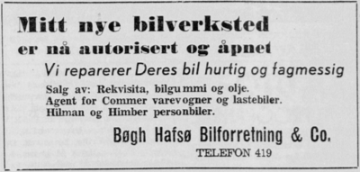 Bøgh Hafsø Bilforretning begynte først å forhandle merkene Commer, Hillman og Humber fra den britiske bilprodusenten Roots. På denne tiden måtte bilkjøpere ha offentlig tillatelse for å kjøpe importbiler, og Bøgh Hafsøs salg var derfor begrenset. Datidens bilbransje – særlig utenfor storbyene – var på ingen måte så glamorøs som den senere kom til å bli. De måtte ta nattoget til Oslo, gi kontant oppgjør for bilene, og så kjøre tilbake – så vel i sommervarme uten airconditon som i vinterkulde uten varmeanlegg. Dessuten var avansen heller mager: vel 400 kroner pr. bil, noe som også skulle dekke fraktkostnader til og fra hovedstaden.