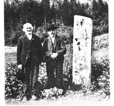 Der er eit bilete i boka av steinen på Berge med to personar attmed: Grunde Berge (1834-1925) var 83 år då biletet vart teke, og Aanund Vinsnes, Berge (1842-1928) var 75 år gamal. Det er då teke i 1917. Fotograf: Bendik Taraldlien.