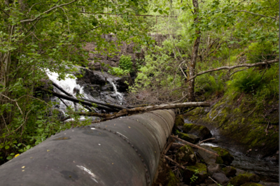 Rørgata som sikret vannføringen til Siggerudsaga, i bakgrunnen den rundt tre meter høye steindemningen som demmer opp og vannene ovenfor til et sammenhengende vannspeil.