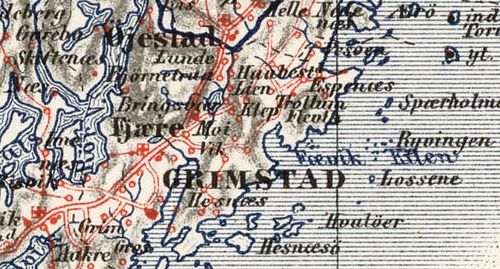 - Det er spesielt interessant at dette kartet indikerer hus og bosetninger. Det er bare Grimstad sentrum som har fått skravering for tett bosetting.