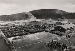 Siste appell før frigivelse 8. mai 1945. Bildet er nok tatt fra fjerde etasje i den originale fengselsbygningen mot nordvest og den store appellplassen. Den tverrstilte brakka helt til høyre i bildet er Magasinet, brakka langsmed appellplassen er kjøkkenbrakka, og den parallelle og noe mindre bak denne er en vaskebrakke. Brakka ved enden av appellplassen er kantinebrakka, de øvrige brakkene er fangebrakker. Tre av vakttårnene sees i bakgrunnen. Åsen i bakgrunnen er Brunkollen. (1945) Grini fangeleir ( ty:, Gefangenlager Grini, brukt av ledelsen på dokumenter og skriv under krigen, i senere litteratur Polizeihäftlingslager Grini) var den største tyske fangeleiren i Norge under andre verdenskrig. Leiren er ikke oppført på grunnen til den nærliggende gården Grini, men på plassene Nedre og Øvre Ilen under Nordby gård i Østre Bærum. Anlegget var opprinnelig tiltenkt som kvinnefengsel, men ble fra 1940 tatt i bruk som interneringsleir for norske offiserer, senere som fangeleir for politiske fanger og kriminelle som en av fire Sipo og SD-leire, sammen med Krøkebærsletta, Falstad og Espeland. Som Sipo/SD-leir var øverstkommanderende for disse sjefen for Sipo og SD i Norge, Heinrich FehlisStaten eksproprierte i 1930-årene begge Ilenplassene for oppføring av et nytt kvinnefengsel kalt Grini, trolig med navn etter «Grini hjem for voksne kvinner som hadde stelt sig galt» på gården Grini i Vestre Bærum. 16. september 1938 meldte Aftenposten at entreprenørfirmaet Brødrene Vister hadde fått oppdraget med å bygge kvinnefengelset, og at dette skulle ta et år. Anlegget skulle bestå av en bygning på fire etasjer med plass til 60 innsatte, samt en mindre bygning 60 meter fra hovedbygningen som skulle være isolat med ni celler.