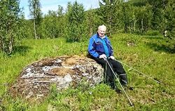 Georg Karlstad på tur i Prostgjerdbakken i Rossfjordbygda i Lenvik kommune. Her passerte de når de gikk fra Tårnstad til Straumen for å handle. Her var det at Ole Pettersson etablerte seg 10. februar 1826. Vi skimter en av steinene etter tuftene. Foto: Gunnhild Lauknes 2015