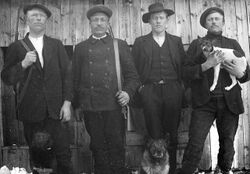 Halvor O. Breive var ein ivrig jeger. Her er han og tre kameratar rusta til jakttur. Frå venstre: Gunnar H. Brokke, Halvor O. Breive, Hallvard H. Brokke, Olav H. Brokke. Frå Setesdalsmuseet. Foto: Knut Jonsson Heddi