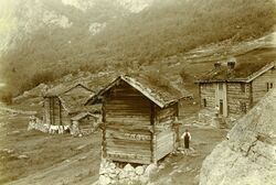 Tunet i Neire Mosdøl i den tida då Lunden og Berget hadde sams våningshus. Mannen ved loptsnova er Torleiv Drengsson, kvinna på trappa er ikkje identifisert. I høgre biletkant ser ein noko av det berget som har gjeve namn til bruket. Biletet vart teke av August Abrahamson ein gong i tida frå 1900 til 1910. Frå samlinga ved Setesdalsmuseet.