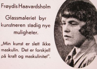 En kunstners bortgang fremkaller forestillinger om det mer ugripbare begrep epokeslutt, tidehverv. Frøydis Haavardsholm ble vel 88 år gammel. Med sitt første illustrerte bokverk i 1917 (Martin Luther, Om et kristenmenneskes frihet) og sin siste kirkeutsmykning i glassmaleriene til Finnøy i 1960 som ytterpunkter i et ufattelig produktivt livsverk, har hun skaffet seg en ruvende plass i vår kunsthistorie. … Hennes stramt stiliserte, men samtidig energiske og «talende» figurstil innrammet i håndfast gotikk er det norske svaret på Art Deco.