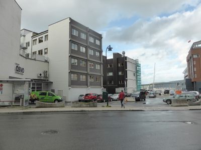 Her omtrent, til høyre på denne parkeringsplassen, lå Fr. Langes gate 1.