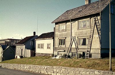 Grønnegata 136-140 i lav høstsol omkring 1960. Nr. 140 skal få et strøk maling.