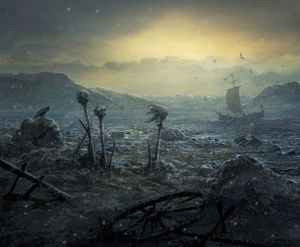 Steglholmen 1750 der hodene fra Steffen Olsen, Iver Hansen og Anna Steffensdatter («Steggel-Anna») ble satt på stake etter at de året før hadde drept to samegutter. Maleri av Rado Javor