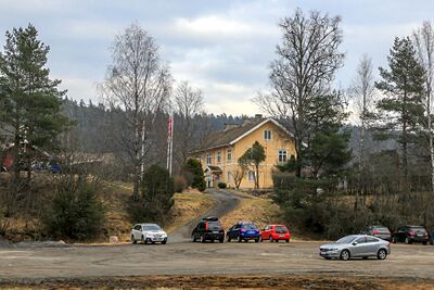 Høykrokholveien starter som en bakke bak parkeringsplassen og tar av til venstre foran våningshuset på Krokhol gård.