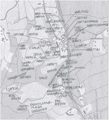 - Namn i Nordstun: Jordet, Bekken, Hemlibakken, Åsdalen, Kjonfløtten, Ulvedalen, Dammen, Væle, Kulpen, Styrten, Inngjerdinga, Sameia, Hemlistuvegen, Slettbakken, Hemliberget, Syndre Enga, Damjordet og Osprabben.