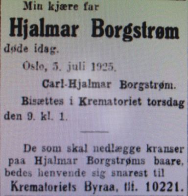 Faksimile fra Aftenposten 8. juli 1925: dødsannonse for Hjalmar Borgstrøm.