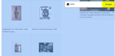 For å redigere et eksisterende galleri venstreklikker du hvor som helst i galleriet. Området blir lyseblått, og du får opp knappen «Rediger». Trykk på denne, og bruk boksen som kommer opp til å redigere bildetekster, legge til flere bilder, slette bilder osv.