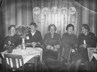 Jaren sanitetsforenings 50-års jubileum på Jaren Bad i 1969. Fra venstre: Thea Aase, Jenny Torgalsen, Olga Borgli, Hjørdis Karlsen og Margrethe Johnsrud. Eier: Randsfjordmuseet