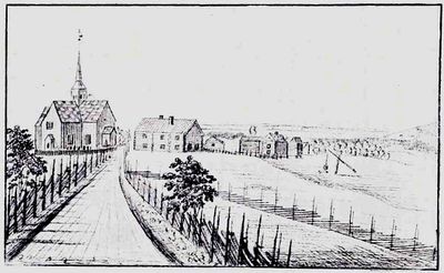 Tegning av Mathias Wilhelm Eckhoff fra 1825. De daværende gardsbygningene på Aas til høyre. Til venstre Ås gamle kirke som brant i 1915.