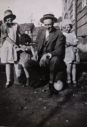 Eugen og døtrene utafor hjemmet deres i Thurmanns gate 5. Jentene er fra venstre Anne, Gerd og Edith.
