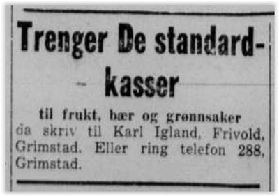 - I 1974 heter firmaet "Grimstad Bygg og Trelast A/S". I annonsen nevnes at det tidligere het "Frivoll Kassefabrikk og Bygg A/S".[9]