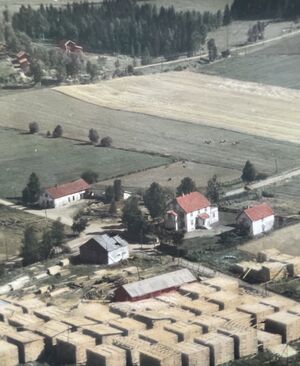 Myrvang bak saga og eiendommen Gilebo, fargelagt 1949 Widerøe Flyfoto. Hobøl Historielags bildesamling