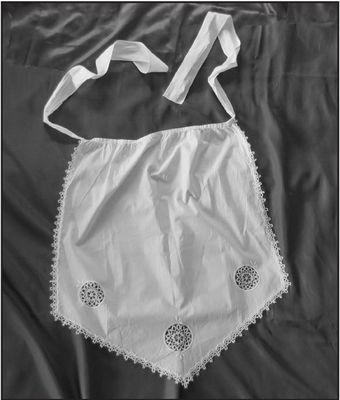 Mange syntest ikkje det var jul før juleforkledet kom på – som regel raudt med grøn pynt. Seinare med sølv- og gulltrådar. Marit har eit typisk juleforkle på gruppebiletet. Dette serveringsforkledet er det lagt mykje arbeid på, med nupereller innfelt i forkledet og rundt kanten.