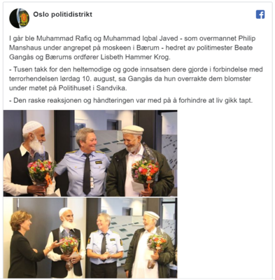 De to ble hedret av politimester Beate Gangås og ordfører Lisbeth Hammer Krogh under et møte på Politihuset i Sandvika like etter terrorangrepet. – Det er ikke tvil om at den raske og kontante inngripen fra dem som var i moskeen, har stoppet gjerningspersonen og dermed hindret ytterligere konsekvenser. Det er ikke ufarlig å gripe inn mot en bevæpnet person, og de har vist stort mot, sa enhetsleder i Oslo-politiet Rune Skjold til NRK etter angrepet.