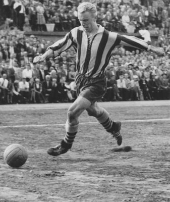 Tætt Bendiksen i kjent positur på grusbanen på Harstad Stadion 1953.