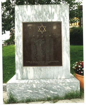 Det var åtte jødiske familier i Tromsø før andre verdenskrig. De fleste kom fra de baltiske landene på 1920-tallet og søkte tilflukt her, langt fra Europas jødeforfølgelser. Flere drev forretning i nærliggende Strandgata, Kirkegata eller i Storgata. - 18. juni 1941 ble alle jøder i Tromsø arrestert og året etter ble de sendt til Tyskland via Grini. Ingen kom hjem. - I forbindelse med Tromsø bys 200 års jubileum i 1994 ble det tatt et initiativ fra Ruth Fischer Granum, arkitekt Terje Jacobsen og Markus Rotvold om å samle inn penger til et minnesmerke over de drepte jødene. Responsen var god og den 18. juni 1995 ble monumentet, utført av Einar Berg, avduket. På minneplaten står det 17 navn, fem fra familien Caplan, fem fra familien Shotland, tre fra familien Sakolsky, foruten Klein, Resnick, Smith og Fischer.