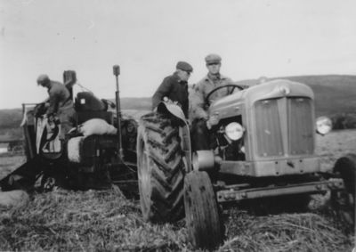 Skurtresking med slepetresker på Åker i Øvre Eiker i 1956. Traktoren er en Fordson Major 1954-modell. Slepetreskeren er en John Deere 1950-modell. Fra venstre ser vi gårdsgutten, som var dansk, Olav Krekling og Petter Aker. Informant er Per Aker, og bildet er registrert i 1989 av Arne Thorkildsen.