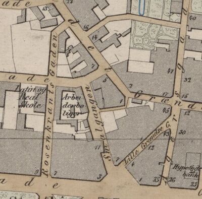 På dette utsnittet fra Næsers generalkart fra 1861 vises fortsatt den gamle Smalgangen.
