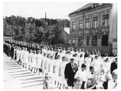 Oppmarsj på Trøndelag Arbeiderkorforbunds sangerstevne i Steinkjer 1947. Vi ser Damekoret i draktene – som var så hvite at «de skar i øynene» på publikum. Fremst i midterste rekke går dirigent Ludvig Moe Weigner og mannen som går foran i den nærmeste rekka er kemner Arnold Aalberg. Han var Arbeiderkorets tillitsmann for Damekoret. (Tankegangen var nok at kvinner trengte menn til å passe på seg).