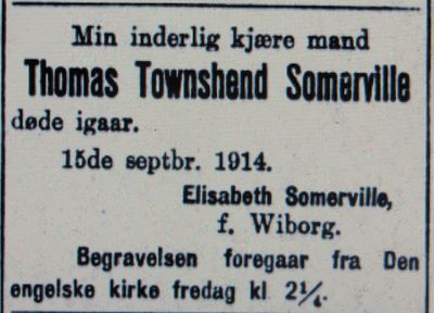 Dødsfallet til Thomas Townshend Somerville ble omtalt i en notis i Aftenposten 15. september 1914 (her gjengitt i sin helhet):