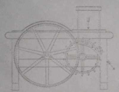 I brug viste det sig at denne maskine var forholdsvis god, idet den greb torven uden vanskelighed, men paa grund af traktens form bliver madningen besværlig naar maskinen skal betjenes af en mand. Alt torvstrøet slngedes du i pilens retning, som paa tegningen antydet, medes derimod omkring 20 pct. af torvmulden blev fraskilt og slyngedes ned paa golvet, fornemmelig i den bagre ende af maskinen. Dette maa betraktes som en fordel.