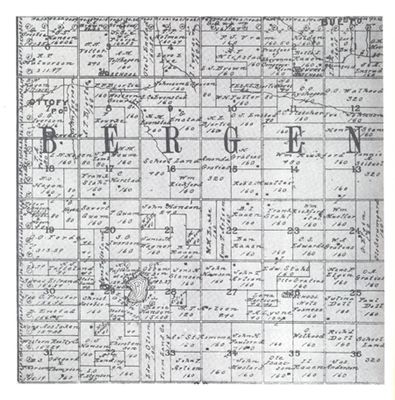 Ser vi på Bergen-kartet finn vi farmen til O. (Ole) J. Enstad som «SE 1/4 of Section 10, Township 149 North Range 60 West of the 5th Meridian». Dette tilsvarar altså gards- og bruksnumra våre. Ein farm kunne og kan sjølvsagt bestå av fleire slike «bruksnummer», når eigaren har kjøpt saman fleire parsellar. Kartføringa er litt forskjellig frå det vi er vant med. Av Bergenskartet ser vi at seksjonsnumra og grensene er påført, og så namnet på eigaren.