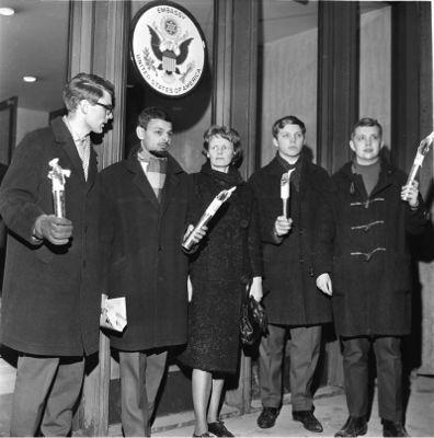 Fredsaktivister protesterer mot amerikansk krigføring i Vietnam, under den første store demonstrasjonen mot Vietnamkrigen i Norge i 1965. Klikk på bildet for mer informasjon.