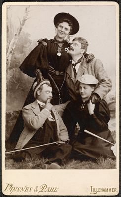 Portrett av Johannes Müller, Knut Hamsun, frøken Lund og frøken Konow. Visittkort.