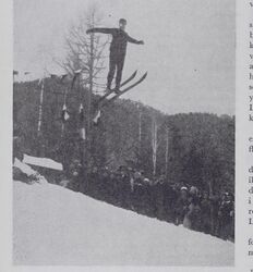 Olav Bjaaland hopper i Chamonix i 1909 for Norge og Kviteseid idrottslag. Foto: Ranheim: Norske skiløpere (1957) Kviteseid idrettslag, KIL, ble stiftet 1904.