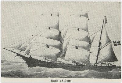 I N. R. Nielsens "De hvite seil" finner vi følgende omtale av bark "Sidon": "Bark «Sidon» av Arendal blev bygget i Arendal i året 1875 og var pa 405 register tonn. Førere var ifølge Norsk Veritas: