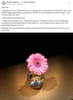 I resepsjonen i 22. juli-senteret finner du 77 ganger i året en liten blomst. Én blomst for hver av de drepte i Regjeringskvartalet og på Utøya. Én blomst for hver bursdag som kommer og går - uten at noen av dem blir eldre. I dag skulle Hanne Kristine fylt år. Vi håper alle som besøker oss - skoleelever og andre - fortsetter å huske hva de menneskelige kostnadene av konspirasjonsteorier, vold og terror er. De er mange, de som savner noen hver eneste dag på grunn av 22. juli. Med tiden som går er det ekstra viktig å minne hverandre på. For alt som skulle vært. For alt de kunne blitt.[4] | ||