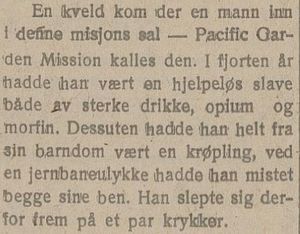 - «Dessuten hadde han helt fra sin barndom vært en krøpling, ved en jernbaneulykke hadde han mistet begge sine ben.»
