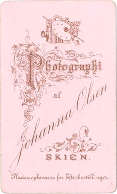 | Johanna Olsen (1850–1929) er basert på data fra Preus Museums registre over norske fotografer og fotografiske samlinger, som er tilgjengelig på Nasjonalbibliotekets nettsider. Artikkelen er lagt ut under lisensen cc-by-sa. Lokalhistoriewikis brukere kan fritt redigere og utvide artikkelen. Flere artikler finnes i denne alfabetiske oversikten. |