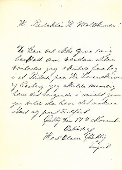 Brev fra Karl Olsen Østby til Johan Castberg. Johan Castberg hadde sin politiske base på Opplanda, noe som fikk mange utslag. Blant annet var det mange som beundra Castberg så sterkt at de oppkalte barn etter ham, eller ville ha portrettet hans hengende hjemme. En av disse var Karl Olsen Østby fra Trysil (ukjent fødsels- og dødsår), som ca. 1907 skreiv dette brevet til Velgeren-redaktør Hans Volckmar. Brevet er udatert, men har blitt oppbevart sammen med en del andre brev fra åra 1906 og 1907 (Opplandsarkivet, avd. Mjøsmuseet, TM/0152).