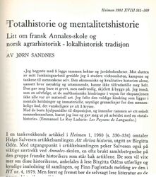 Uke 3 / Veke 3Totalhistorie er betegnelsen på en historiefaglig forskningsnorm som siden 1980-åra har hatt en sterk posisjon innen norsk lokalhistorisk forskning. Begrepet 'totalhistorie' er blitt tilskrevet de franske historikerne Lucien Febvre og Marc Bloch, som regnes som grunnleggerne av den såkalte Annales-skolen. I norsk sammenheng ble den totalhistoriske normen introdusert av professor Jørn Sandnes i 1981, men på dette tidspunktet hadde den allerede en viss posisjon særlig innenfor agrarhistoriske og demografihistoriske miljøer, som begge hadde forbindelser med fransk historieforskning. Ambisjonen om totalhistorie ble formulert slik av Sandnes i et foredrag i 1997: «[G]od lokalhistorie, i betydningen allmenn region-, bygde- og byhistorie, bør være totalhistorie, dvs. gi en samlet framstilling av alle sider ved lokalsamfunnet og menneskene der i fortida: økonomi og produksjon, arbeid, samarbeid, familieliv, konflikter, sykdom, plager, pasjoner, tanker, ideer, religion, forhold til naturen osv.» Kjernen i denne formuleringen er selvsagt påstanden om at lokalhistorien bør gi en samlet framstilling av alle sider ved lokalsamfunnets fortid, hvis den skal kunne karakteriseres som god lokalhistorie. Les mer... | ||||