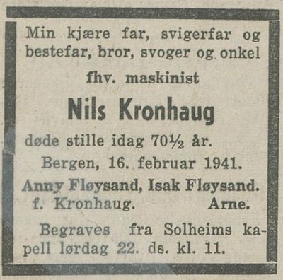 - Dødsannonse for Nils Olsen Kronhaug, Bergens Tidende 1941-02-20. Digital versjon på Nettbiblioteket.