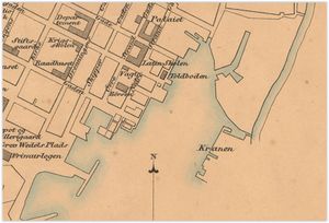 - Sommeren 1851 tilbys "Ved Udløbet af Akerselven (udenfor Tostensens Kran) er en stor Tomt med 2de Pakboder, hvortil Skibe kunne lægge ind, tilleie.". Tilbudet signeres J. H. Schwensen.[3]