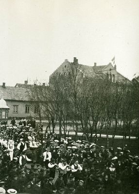 Folketoget feirer årsdagen for unionsoppløsningen, 7. juni 1906.I bakgrunnen ser vi Tromsøpostens lokaler i Storgata 65 og Bankgata 13s kneisende murbygg. Dalsbøs kiosk skimtes til venstre.
