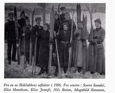 Fra en av skiklubbens utflukter i 1904, Vadsø. Fra venstre: Sverre Samdal, Elise Henriksen, Elise Jentoft, Nils Betten, Magnhild Simonsen, Sofie Olsen, Johan Grøsvigh, Øivind Taraldsen, Ella Aarestad, Sofie Krogh og Thora Dahl.