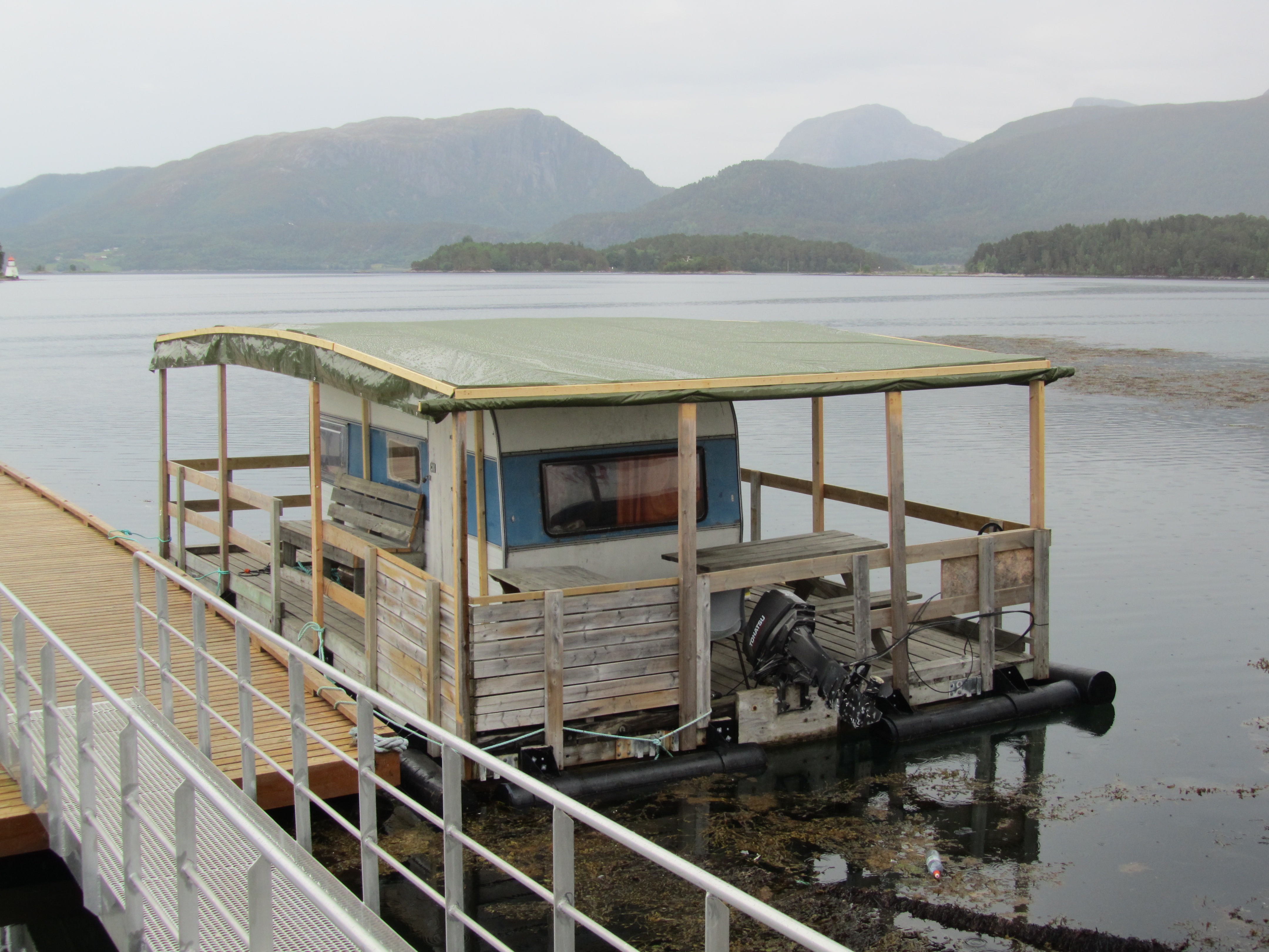 Campingvogn på flote ved kai på Vihals i Aure kommune på Nordmøre. | ||||